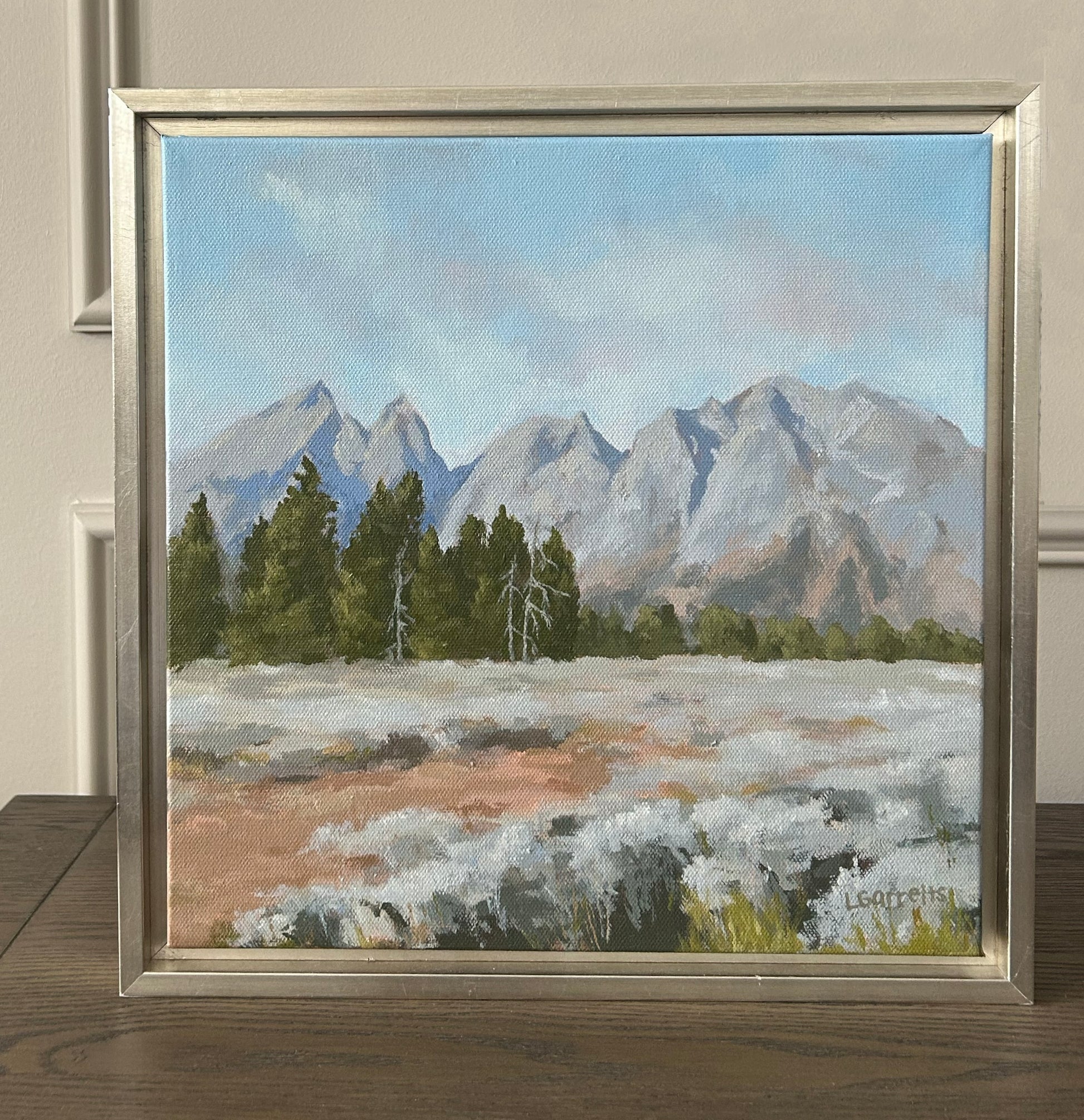 "Many Are The Wonders" is an original, acrylic painting on canvas, framed in a warm silver leaf floater frame. This painting was inspired by a majestic viewpoint of the Teton range in Grand Teton National Park.
