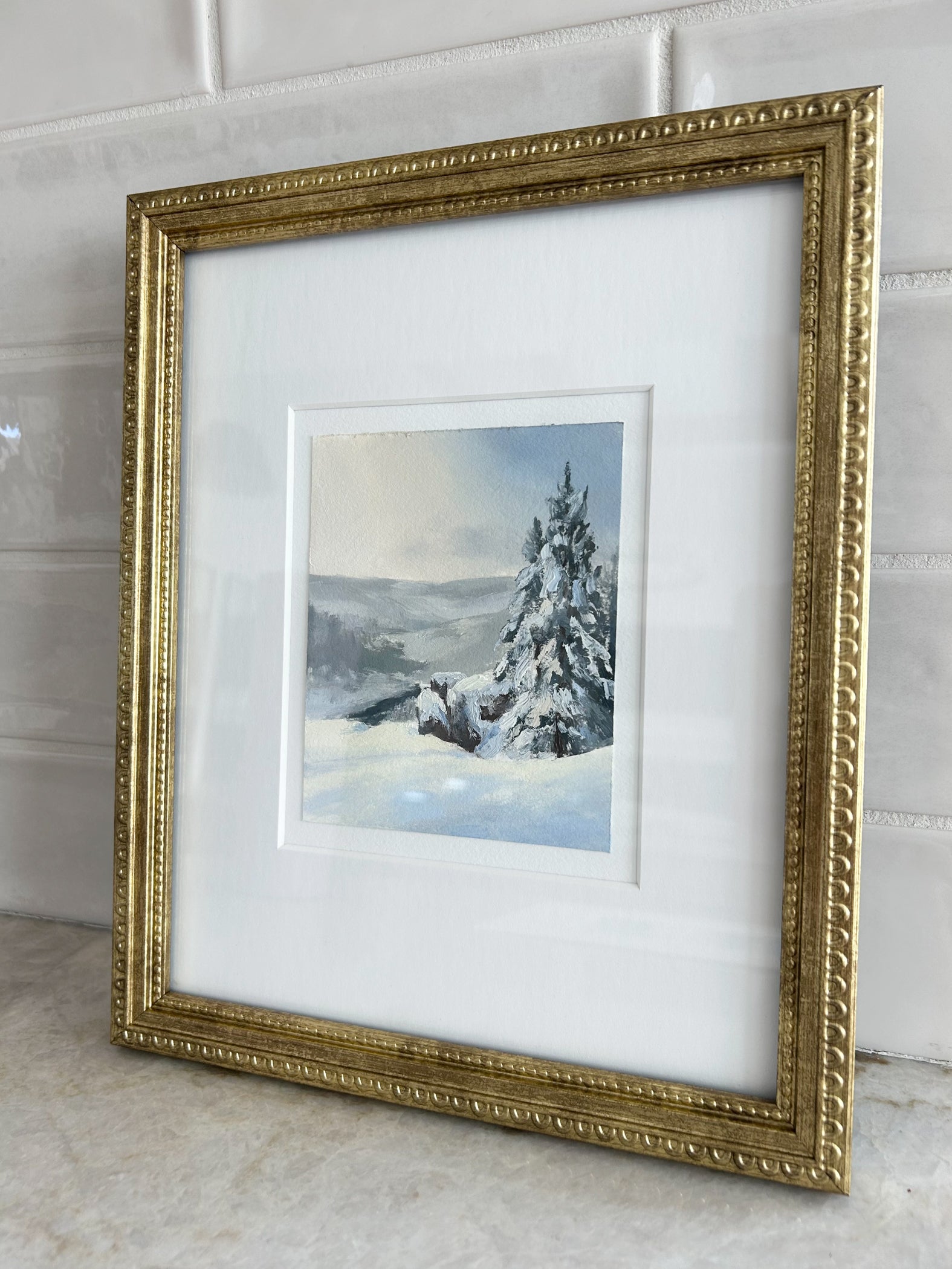 The actual artwork size is 4 x 4.75 inches and is custom matted to fit perfectly inside any 8x10" frame with glass. Frame is not included. The painting is initialed on front, and a full signature is on back.
